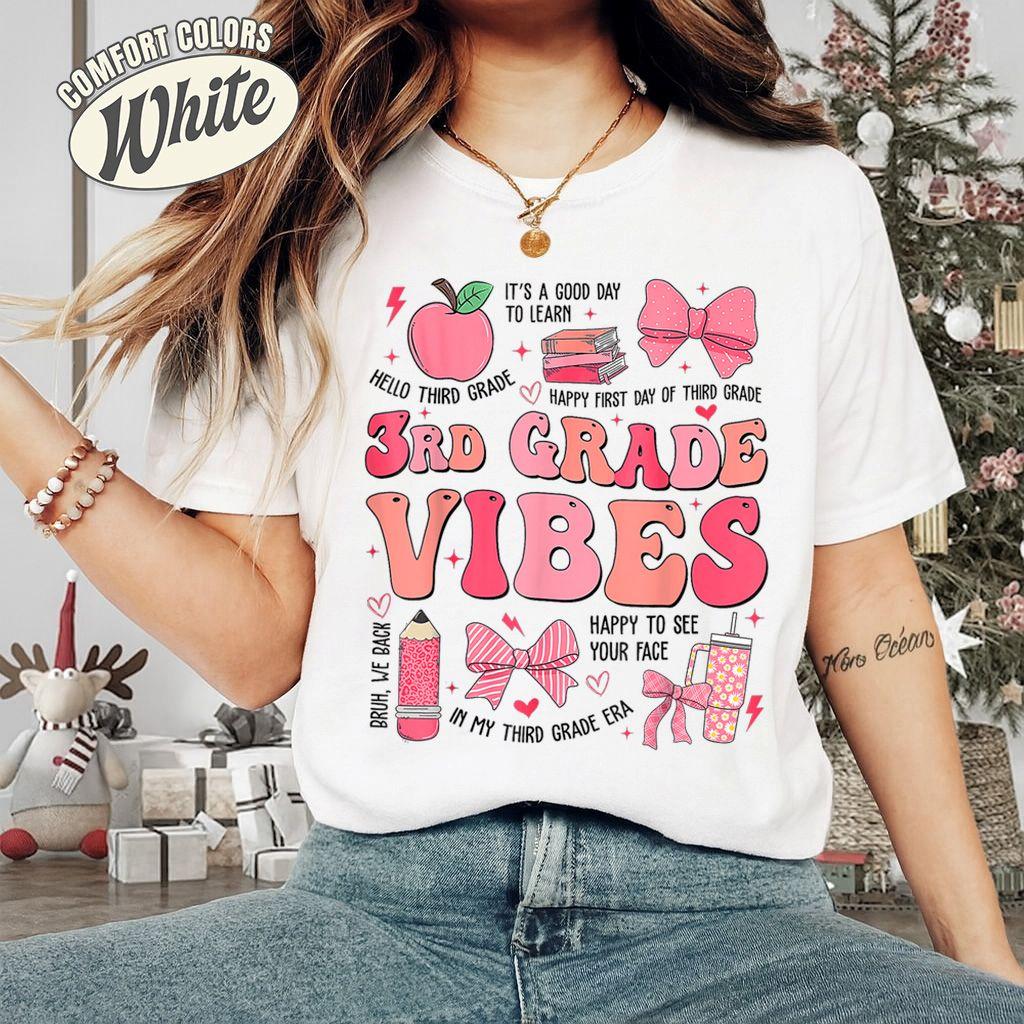 3rd Grade Vibes Shirt | Back to School Teacher & Student Tee | Cute Pink Bow & School Supplies Design | Fun Third Grade Outfit